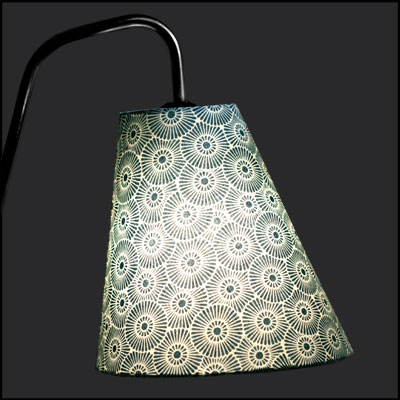 Je choisis le tissu des abat-jours en accord avec la couleur de l’émail de la tablette. le tissu ne doit pas être trop occultant, ni trop transparent afin de diffuser une lumière douce.